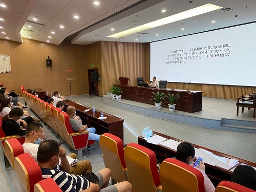 林山老师从闽江文化、洲岛桥文化、海丝文化、名人文化和非遗文化等方面进行了深入浅出的讲述,讲述过程中林山老师还将福州话和普通话进行比对,让大家更接地气地理解我们本土的文化。课上林山老师还提到,在参与古建筑保护时一定要考虑其象征的文化和习俗,切勿片面强调建筑设计而忽略建筑文化本身。课程的最后林山老师在向大家展示海丝文化和仓山区非物质文化遗产保护名录时呼吁大家积极投身到非遗文化的建设和保护中去,共同努力传承和弘扬仓山文化。