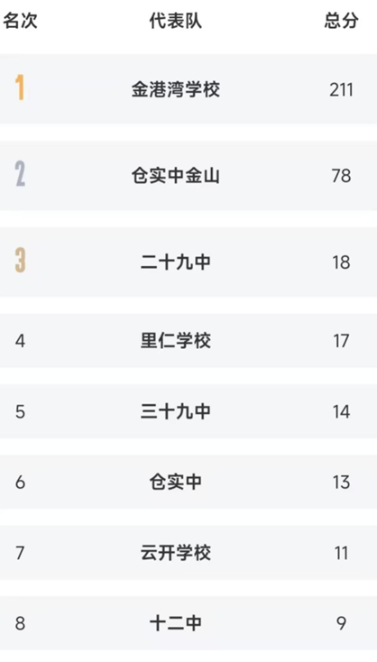 经过两日的激烈角逐,初中组与小学组的团体总分冠亚季军尘埃落定。初中组方面,金港湾学校、仓实中金山校区、二十九中分别以211分、78分、18分的优异成绩斩获团体总分一、二、三名。小学组方面,霞镜小学、仓七小学、仓山小学则分别以241分、150分、137分的出色表现荣膺前三名。初中组、小学组成绩如下: