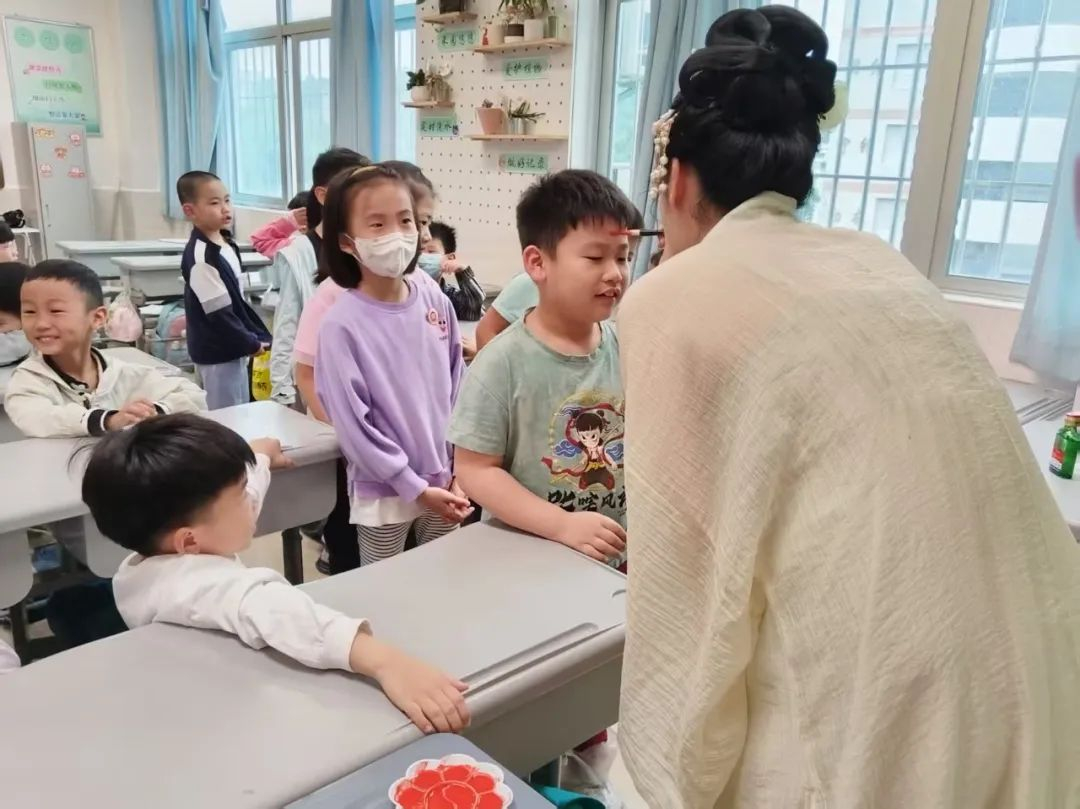 活动现场,身着汉服的志愿者讲解"端午浴兰除毒,雄黄画额避虫"传统习俗中的养生之道,带领师生体验端午古礼。志愿者们以艾草菖蒲煮水轻洒祛秽,执雄黄笔为学童点额祈福,还为师生送上省级非遗项目“福州壶山林氏中医内科”特制中药香囊,这些香囊内含佩兰、藿香、薄荷等道地药材,严格遵循林氏百年配伍古方精制,兼具芳香醒脾、疏风驱蚊之效。