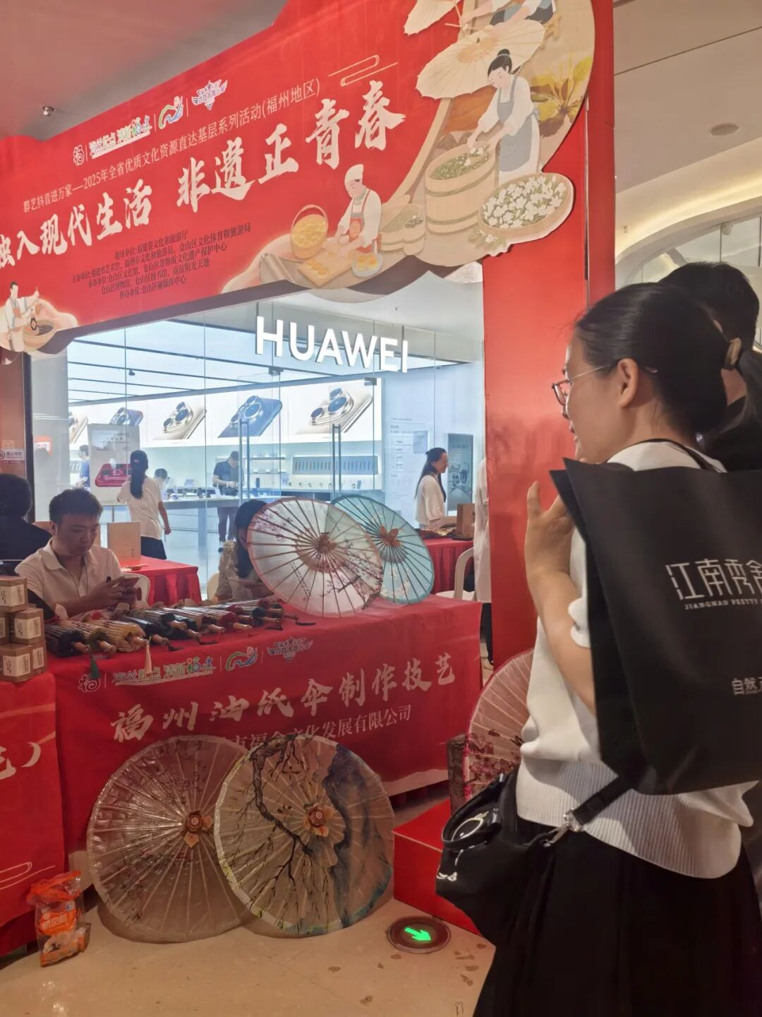 非遗项目互动体验区同样人气高涨。市民们踊跃参与各项体验活动:既有林氏骨伤疗法、壶山林氏中医内科、许氏伤科疗法等传统医药项目提供的义诊服务,也有茉莉花茶、民天虾油、隆福记小吃、百饼园等福州特色美食供大家品鉴,还有福州糖画、油纸伞、郭宅竹编、怀安窑等手工艺项目吸引市民动手体验。