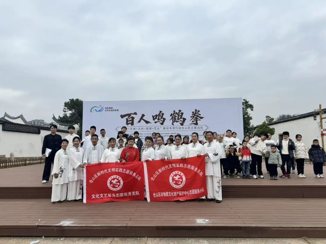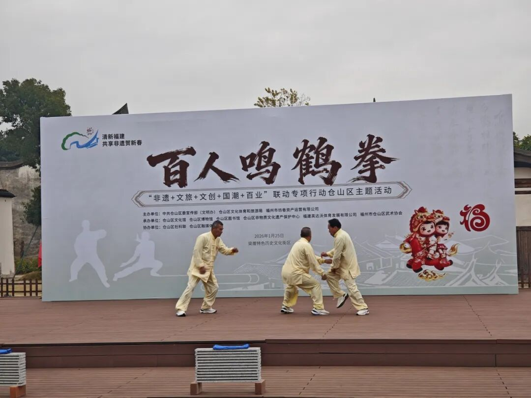 活动现场,鸣鹤拳市级传承人黄小东和区级传承人林鑫杰联袂献技,展示了省级非遗项目“鸣鹤拳”。鸣鹤拳发源于仓山区盖山镇高盖山鹤巢寺,融合白鹤拳之灵巧与罗汉拳之刚健,形似白鹤理羽,善用掌法,尤重“以声助力、声随拳走”,故名“鸣鹤”。其技艺背后蕴藏着代代相传的传奇故事与深厚的地域文化记忆,是福州武术文化的重要代表。