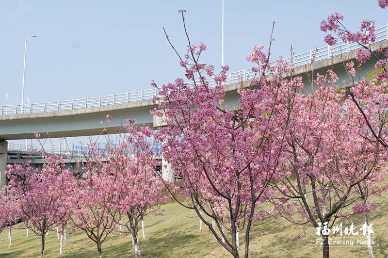 眼下,在乌龙江公园沙滩园区内,40余株福建山樱花“红粉佳人”竞相绽放,如云似霞,吸引众多市民前来观赏。
