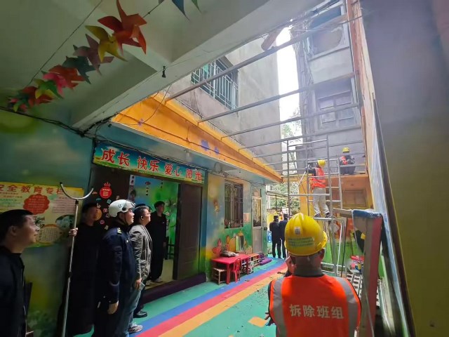 在金山街道,对采菊苑12号楼架空层、泰禾红峪28号楼101单元院子内违规搭建进行拆除,累计拆除面积约35平方米。