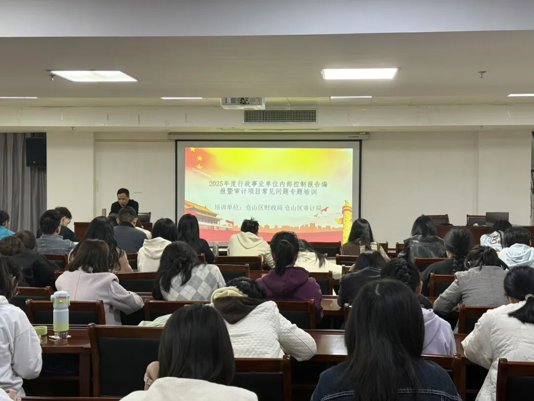 为进一步加强行政事业单位内部控制建设,提升内控报告编报质量,同时对审计发现的重点问题进行学习剖析,做到举一反三,2026年4月2日,福州市仓山区财政局联合福州市仓山区审计局组织召开行政事业单位内部控制报告编报暨审计项目常见问题专题培训会。全区各行政事业单位财务负责人、内控业务骨干、区财政局及区审计局相关业务科室人员共计100多人参加本次培训。