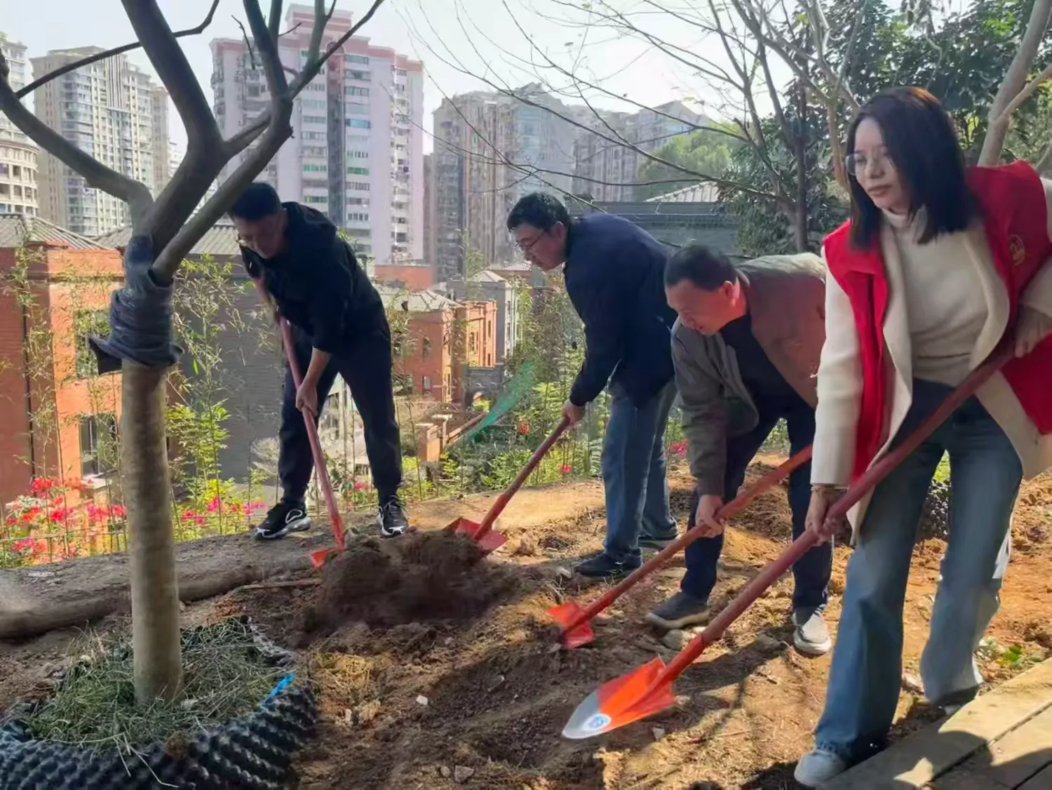 活动现场,党员干部们分工协作、干劲十足,挥锹挖坑、扶苗培土、浇水定根,合力种下13株紫花风铃木。大家在劳动中重温生态文明建设理念,深刻认识到“绿水青山就是金山银山”的发展内涵,进一步树立起“功成不必在我、功成必定有我”的政绩理念。此次植树不仅为烟台山公园增添了新绿,更搭建起党员干部联系群众、服务基层的实践平台,让绿色发展理念扎根心底。