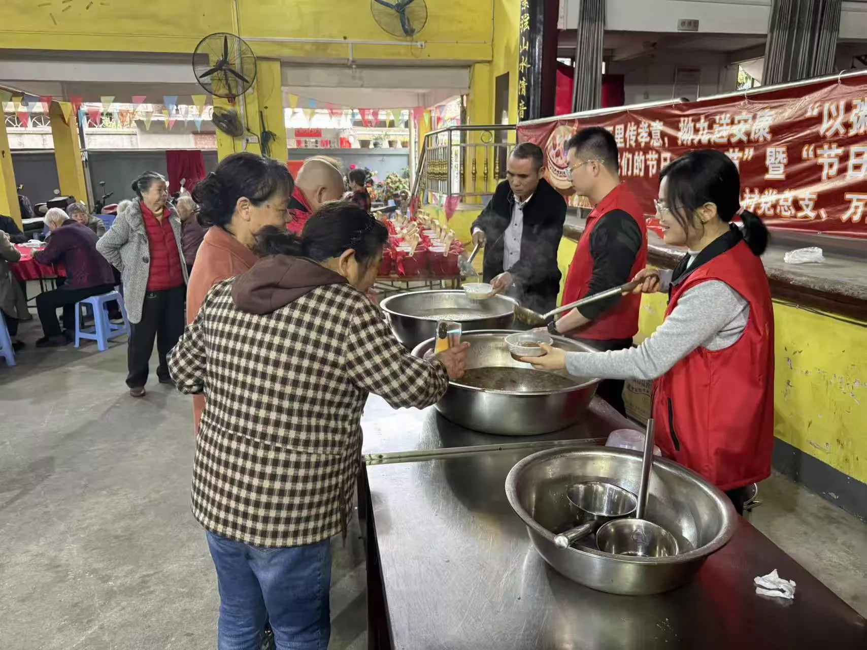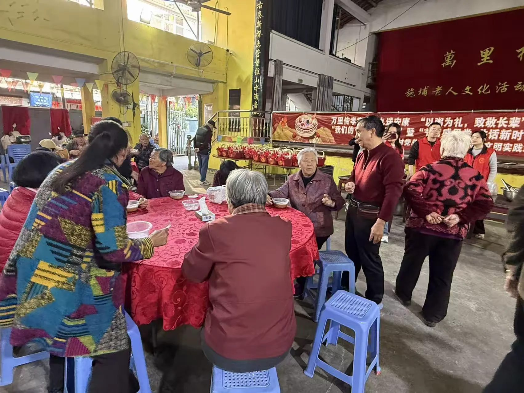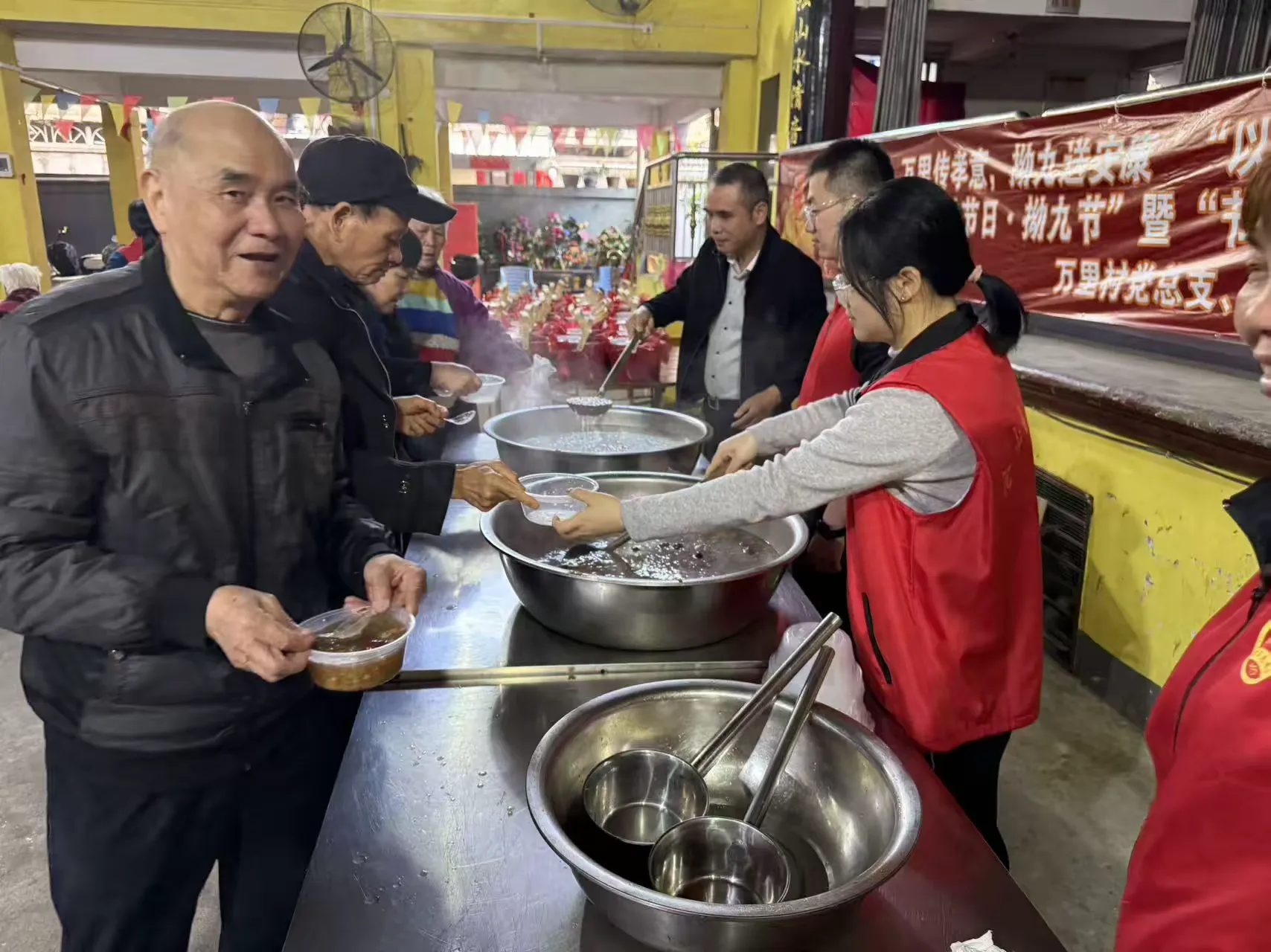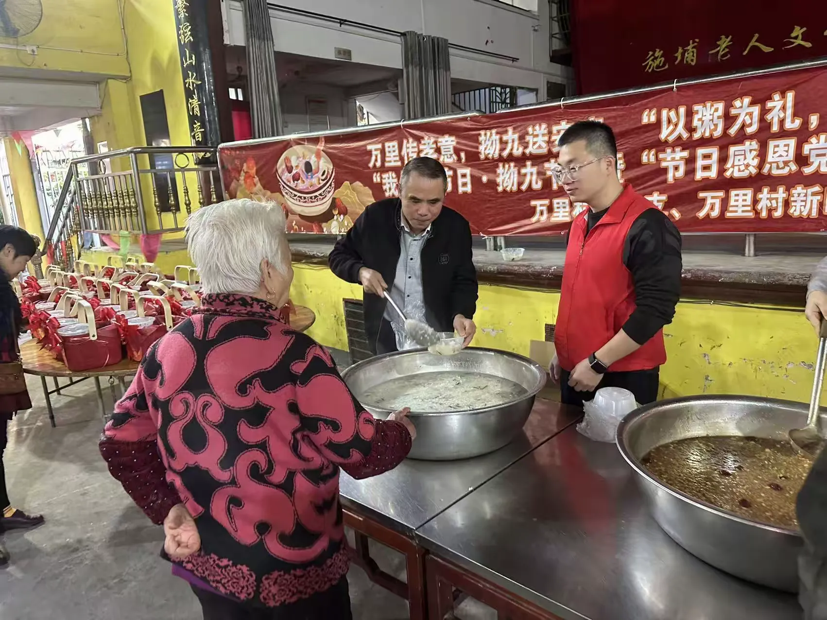 活动当天,万里村幸福院内暖意融融、氛围浓厚,悬挂着“万里传孝意,拗九送安康”“以粥为礼,致敬长辈”“节日感恩党 共话新时代”等宣传横幅,志愿者们身着志愿服装,热情接待前来参与活动的老年朋友们。