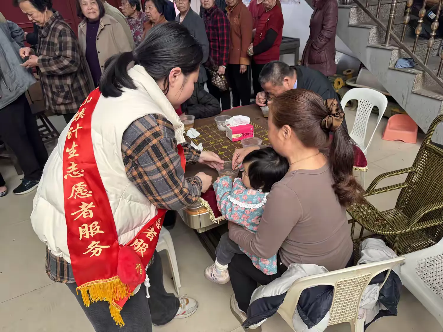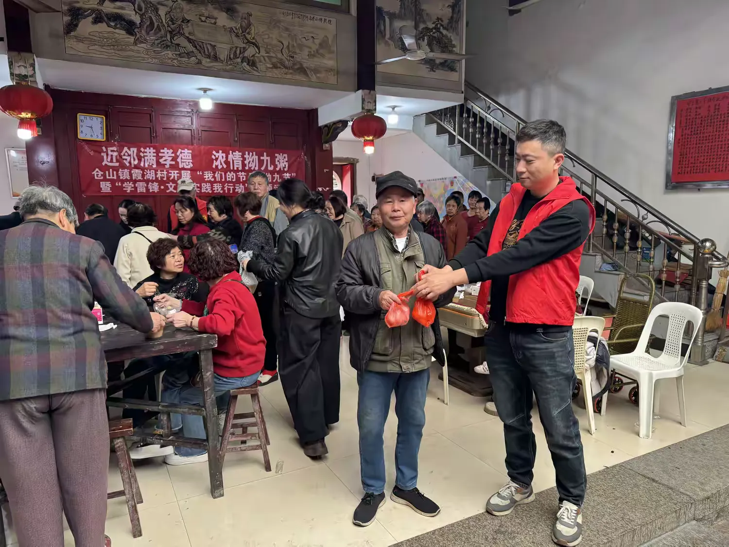 活动现场,志愿者们身着红马甲,积极维护现场秩序,引导村民有序排队,为前来领取太平蛋面的村民服务。今年,霞湖村为605名50周岁以上的老人发放这项福利,表达对老人深深的关爱。