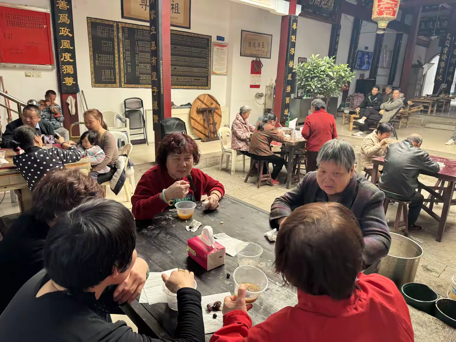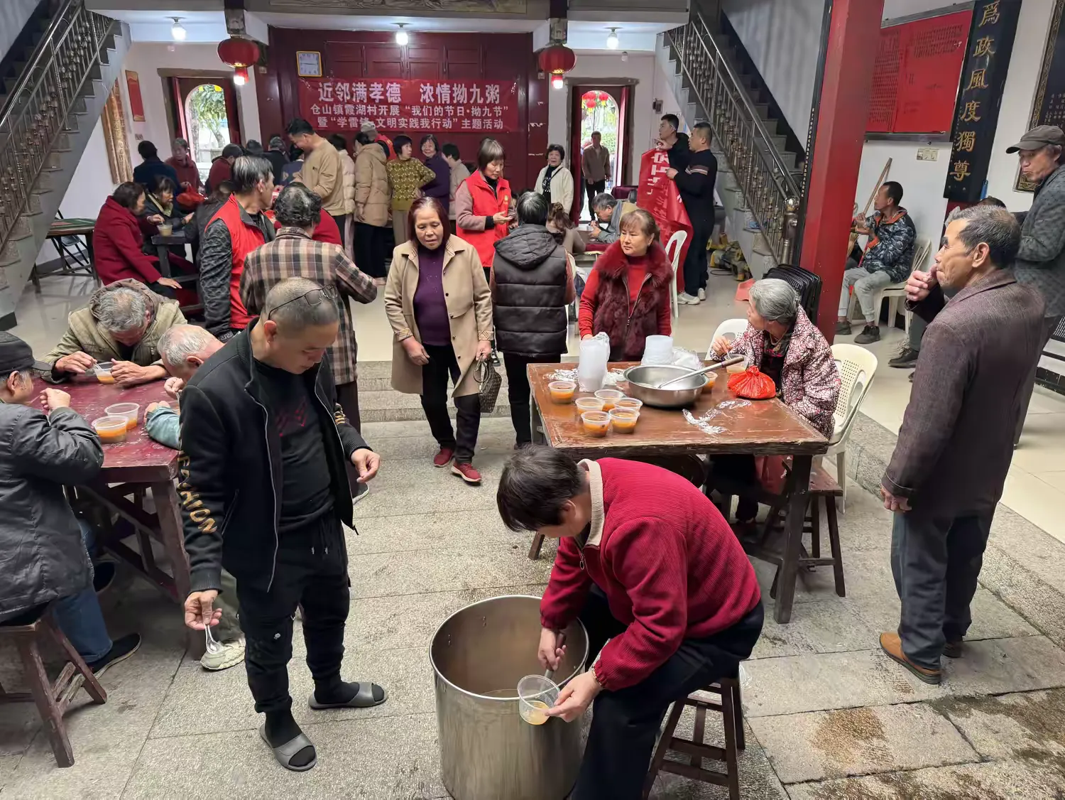 志愿者们将一碗碗盛得满满、热气腾腾的拗九粥,递到长辈手中。大家围坐一堂,一边细细品味,一边闲话家常,分享着过去拗九节的记忆与趣事。碗勺交错的清脆声响,与长辈们的开怀笑声交织在一起,浓郁的邻里温情在此刻静静流淌、缓缓升温。