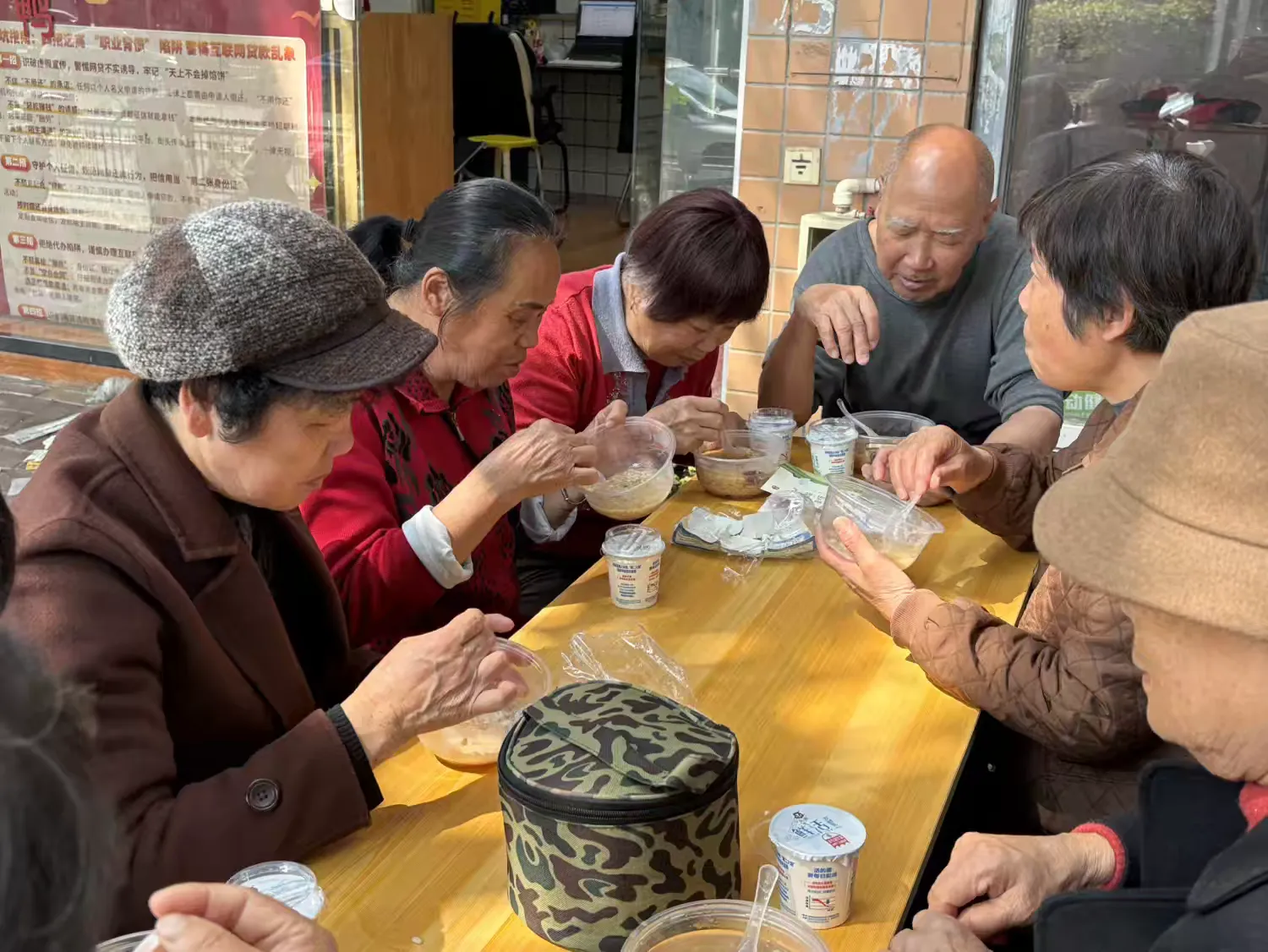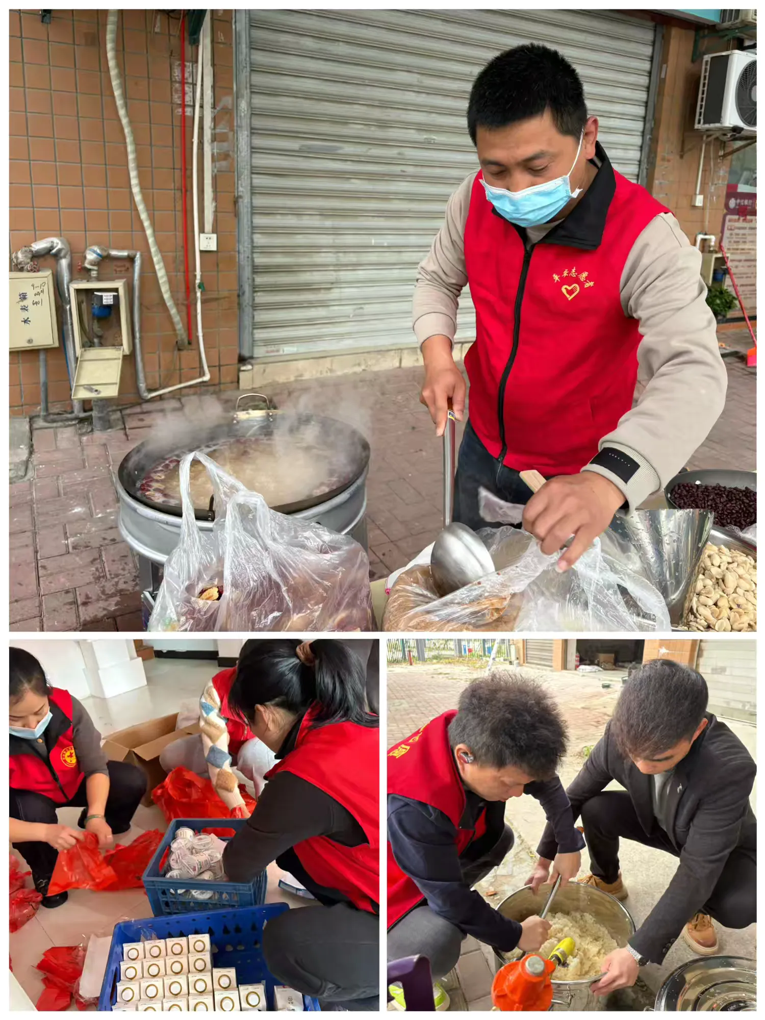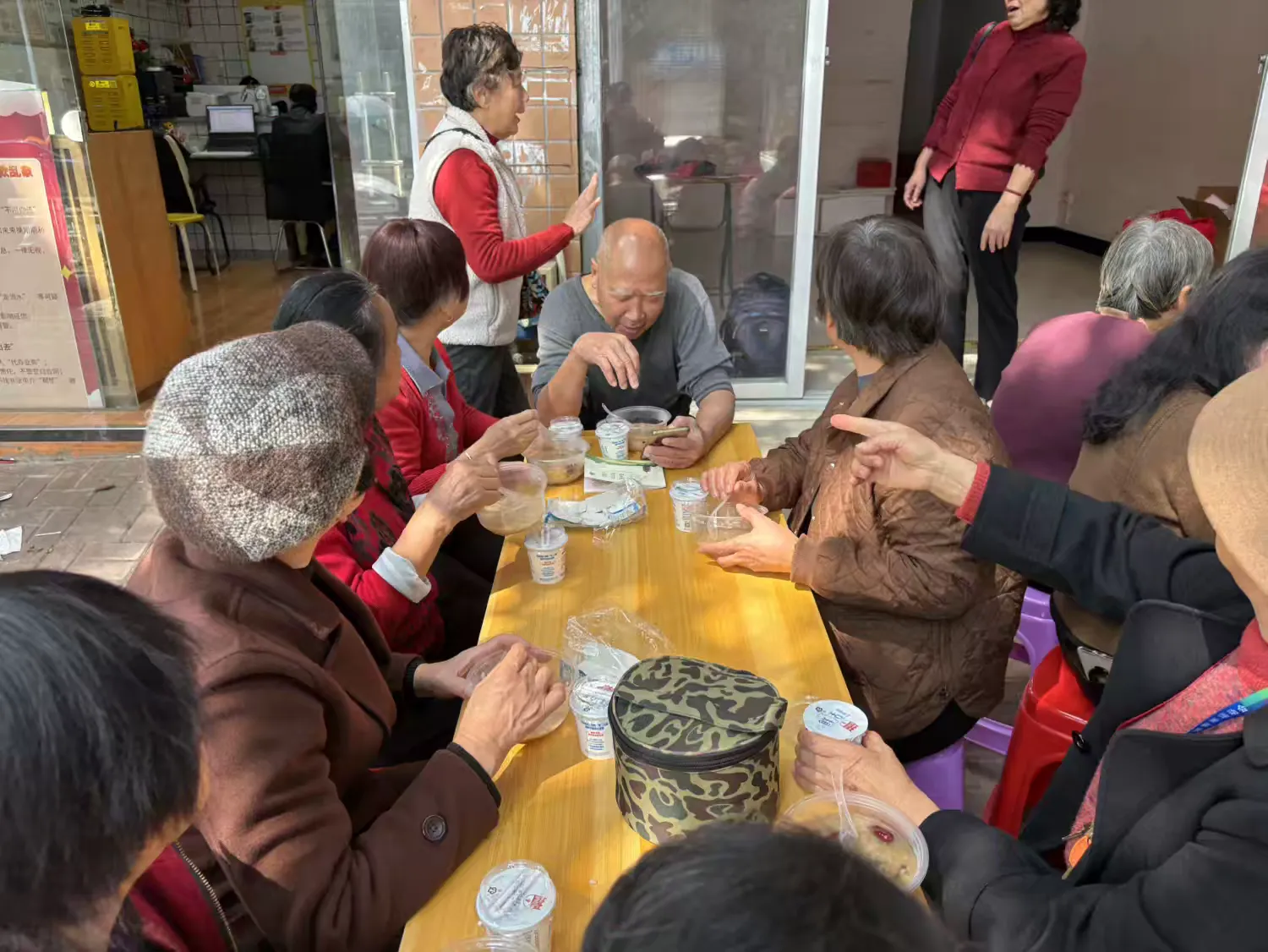 活动现场温馨有序、气氛热烈。社区提前筹备食材、布置场地,社区工作人员及志愿者早早到场,分工协作熬制暖心拗九粥。淘米、配料、熬煮、分装,每一道工序都饱含心意;糯米、桂圆、红枣、花生等食材汇聚一锅,熬出香甜醇厚、暖意浓浓的节日滋味。不少老年居民围坐一旁,讲述拗九节的由来与习俗,让年轻一代在聆听中感受传统文化魅力。