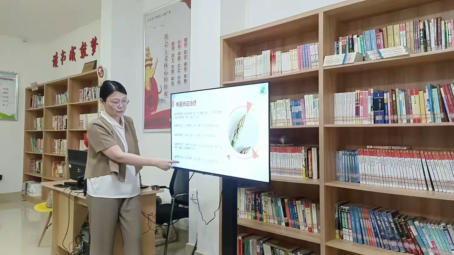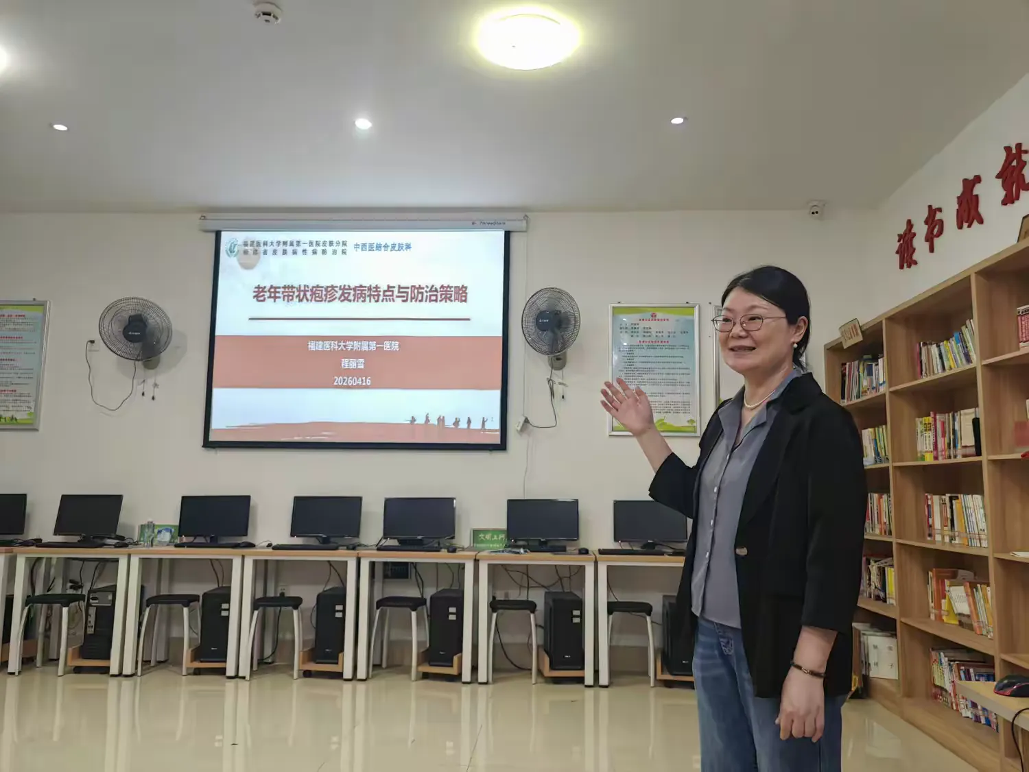 4月14日,讲座分为上下半场进行,内容丰富。上半场由附一医院皮肤科程丽雪主任主讲,主题为《皮肤瘙痒的来源及应对》。春季气候多变,花粉、尘螨活跃,皮肤瘙痒成为困扰许多居民的顽疾。程主任突破传统讲座模式,精心制作了逻辑清晰的PPT课件,并创新性地引入AI小视频,生动模拟了过敏原入侵、皮肤屏障受损及神经末梢反应的全过程。她从皮肤瘙痒的常见诱因(如老年性皮脂缺乏、湿疹、荨麻疹)讲到日常护理误区,详细传授了“不过度清洁、加强保湿修复、科学用药”的三步应对法,让晦涩的医学知识变得一目了然。