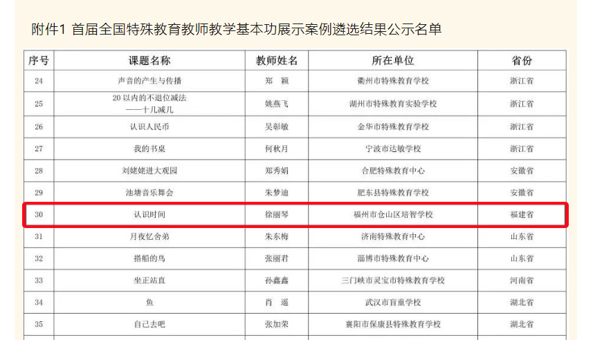 在仓山区教育局“崇尚业务 涵养文化 提质增效”主题活动精神引领下,培智学校聚焦专业,深挖品质课堂。此次研课的过程,在仓山区教师进修学校细心指导下,以仓山区甘霖名师工作室为骨干力量,通过反复听课、磨课为课堂提质增效。经过各省级教育行政部门认真推荐,徐丽琴老师执教的生活数学《认识时间》脱颖而出,代表福建省成功入选!