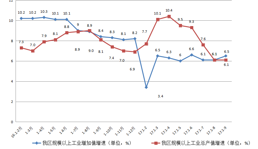 2.工业生产下行已趋稳。前三季度,全区规上工业增加值完成159.38亿元,同比增长6.5%,增速较前两月回升0.4个百分点,与一季度、上半年增速基本持平。该指标增速今年初出现断崖式下跌,并从3月份开始以稍高于6%的速度增长,并基本保持稳定。