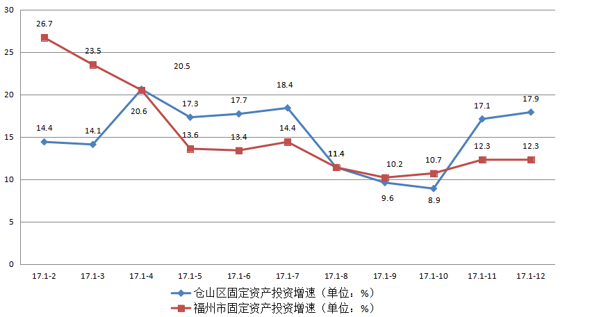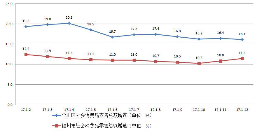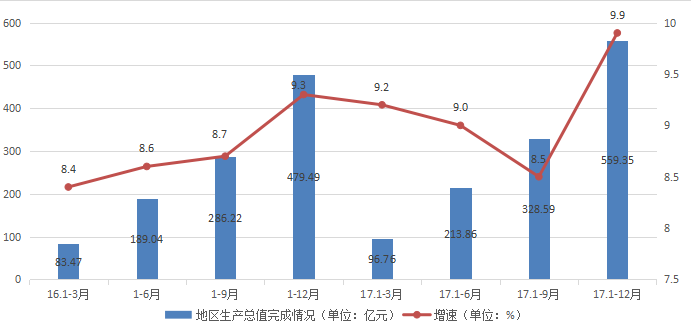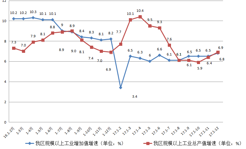 (二)GDP增速升至两年最高点。1-12月份,我区GDP增速升至2016年以来的最高点,比2016年全年增速高0.6个百分点,比前三季度增速高1.4个百分点。从各行业完成情况看:三个产业增加值较前三季度均有所进步,具体行业中除建筑业、批零住餐业和非营利性服务业外,其余行业均有提升,特别是营利性服务业和交通邮政业提升更为明显,均超过3个百分点。