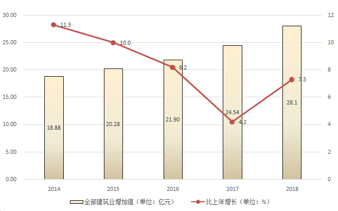 图3 2014-2018年全部建筑业增加值及其增长速度