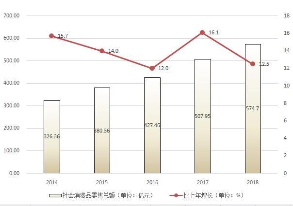 图4 2014-2018年社会消费品零售总额及其增长速度