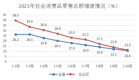 1-10月全区社会消费品零售总额438.12亿元,比增11.2%,增速较上月下降2.6个百分点,高于全市增速2.7个百分点,高于全省0.6个百分点,排名全市第七,与上月持平。其中,限上社会消费品零售总额达到388.6亿元,比增12.1%。