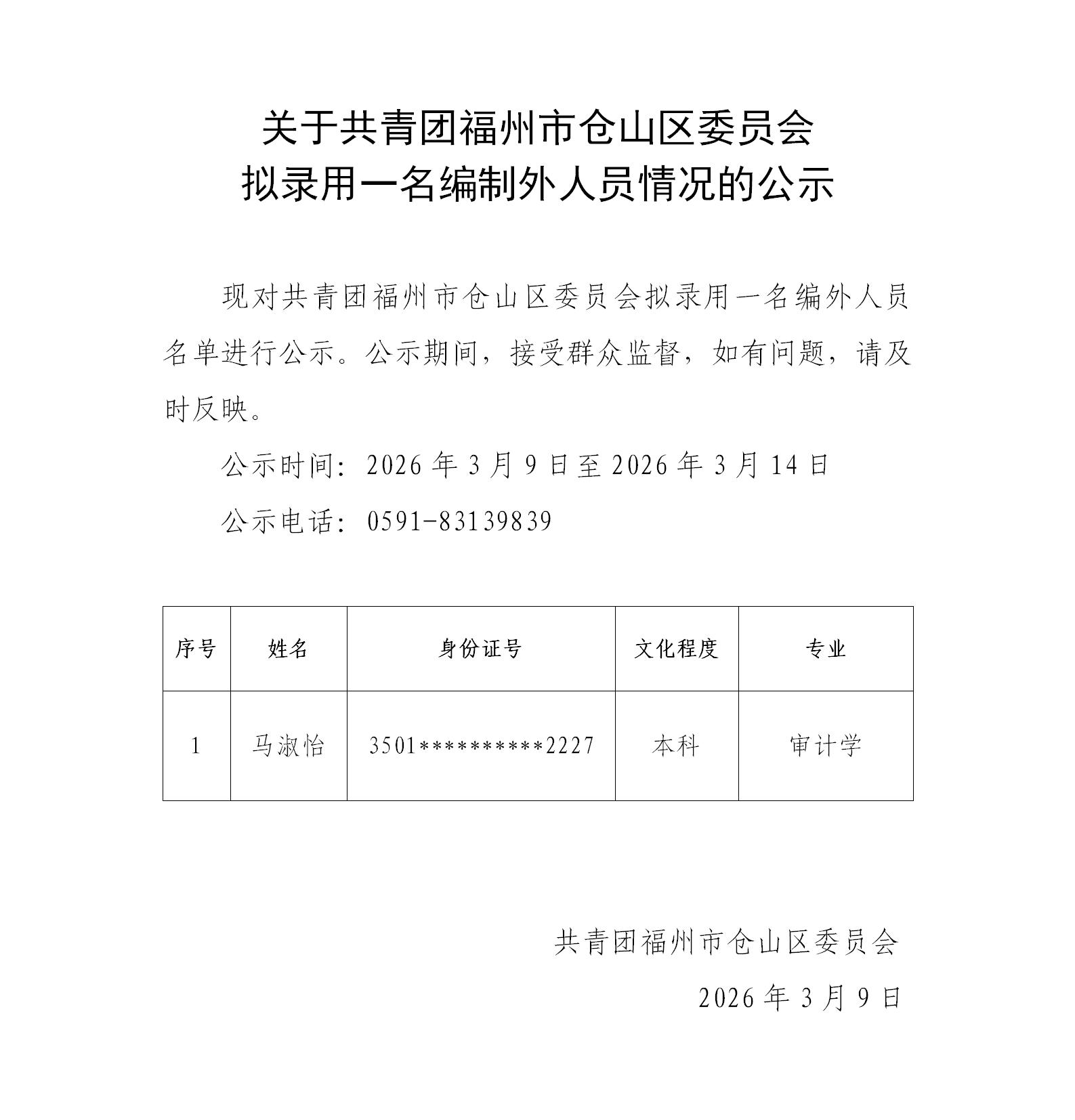关于共青团福州市仓山区委员会拟录用一名编制外人员情况的公示
