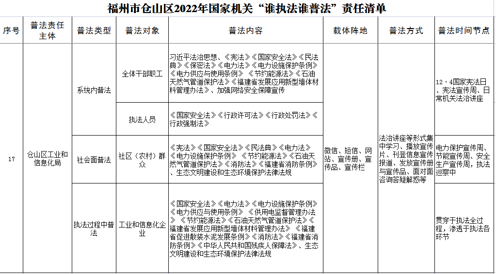 仓山区工信局2022年国家机关“谁执法谁普法”责任清单