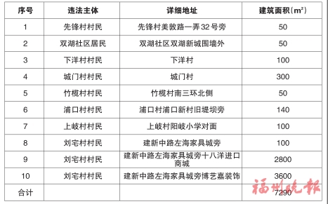 仓山区治违办公布今年第十七批十处限期拆除的违法建筑名单(详见下表),建筑面积7290平方米。这些违法建筑责令改正期限已满,执法部门要求当事人在名单公布之日起七日内自行拆除,逾期未拆除的,执法部门近日将依法予以强制拆除。