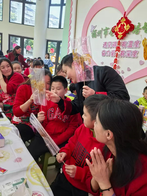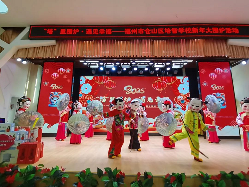 演出在以仓山区国家级非物质文化遗产“陈靖姑信俗文化”为主题的舞蹈《十二婆姐送平安》中拉开序幕,为孩子们送上平安顺遂的祝福。家长和孩子们自主编排的各类节目轮番上演,歌伴舞《千年等一回》、舞蹈《玩偶送福到》展现了培智学子昂扬向上、茁壮成长的精神面貌;《相亲相爱一家人》《花棉袄》以手势舞、情景剧等别开生趣的表演形式表现亲子之间的和睦感情;孩子们跟随《新年好》的喜庆旋律一同尽情舞动,将全场气氛推向高潮。演出期间,来宾们还为每位学生献上仓山区区级非物质文化遗产“糖画”,孩子们拿到糖画后都非常地兴奋和开心。
