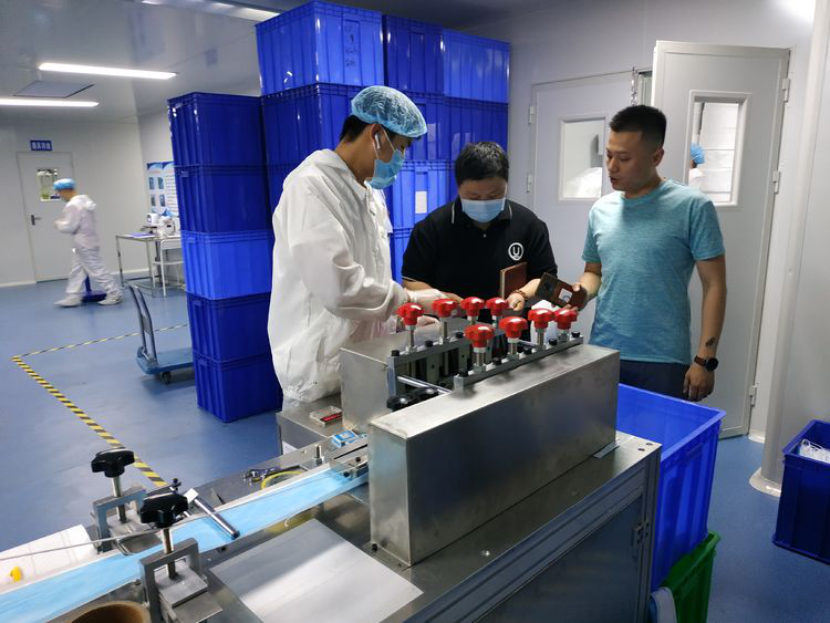 在福建英达沃医疗科技有限公司,专班小组现场查看了该公司口罩生产线,详细了解日用防护型口罩特别是儿童口罩执行标准及产品质量管控情况,指导企业解决生产过程中存在的技术难题。督促企业严格落实主体责任,认真执行生产质量规范和相关技术标准,加强质量管理,进一步完善进货核验把关,及时调整设备状态,保证产品合格,并鼓励企业通过技术手段提高产品质量。专班小组向企业宣传了5月6日市场监管总局(标准委)正式发布的GB/T38880-2020《儿童口罩技术规范》推荐性国家标准,要求企业依标按标组织生产儿童口罩,要取得权威检测合格报告后再行投放市场。