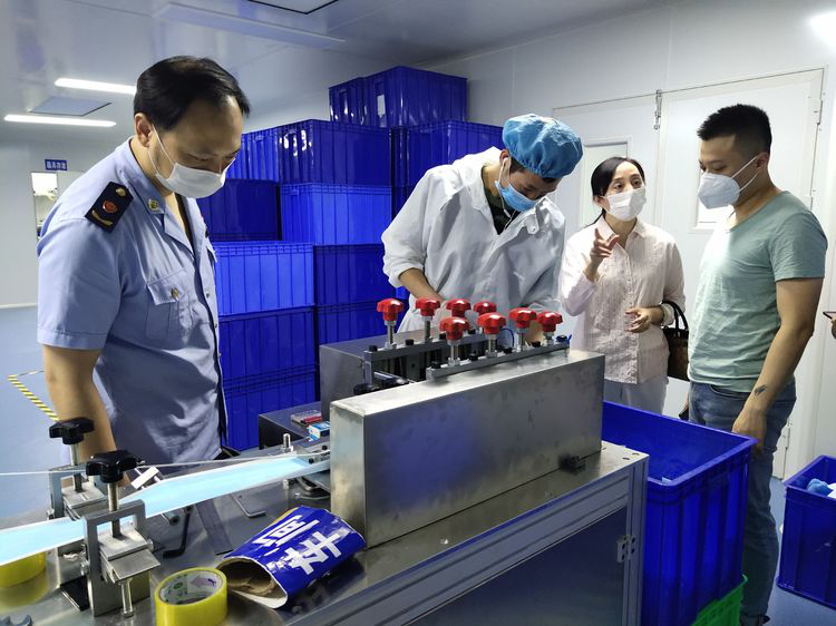 检查人员在福建英达沃医疗科技有限公司现场查看了该公司口罩生产流水线,详细了解企业目前日用防护型口罩特别是儿童口罩执行标准及产品质量管控情况。现场检查发现企业口罩耳带与罩体连接点撕裂力测试结果仍不符合GB/T 32610标准的相关要求,检查人员与企业负责人一同对存在问题进行分析研判,指导企业根据耳带点焊方式不同,对全自动、半自动、人工点焊产品进行分别测试,查找问题根源,并为企业联系技术人员,对企业进行技术帮扶。同时督促企业严格按照产品执行标准组织生产,落实来料检验,强化自检能力,施行精细化管理,保证产品合格,并鼓励企业通过技术手段提高产品质量。